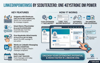 LinkedInPowerMsg oleh ScouterZero adalah ekstensi untuk Chrome yang dirancang untuk meningkatkan efisiensi dalam berkomunikasi melalui LinkedIn. Dengan fitur utama seperti pembuatan snippet pesan yang dapat dipicu dengan kombinasi tombol khusus, pengguna dapat dengan mudah menyimpan dan mengirim pesan yang sering digunakan tanpa perlu menulis ulang. Ekstensi ini juga memungkinkan pengguna menyertakan lampiran file hingga 2 MB, yang diintegrasikan secara otomatis saat mengirim pesan.